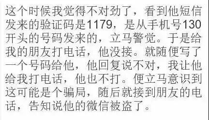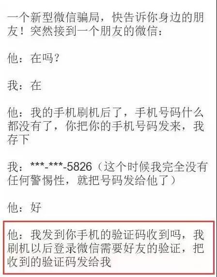 如果有人向你索取短信验证码,千万别给,这可能是要盗取你的微信号,进而盗取你与手机绑定银行卡的钱或者向你的微信好友行骗。